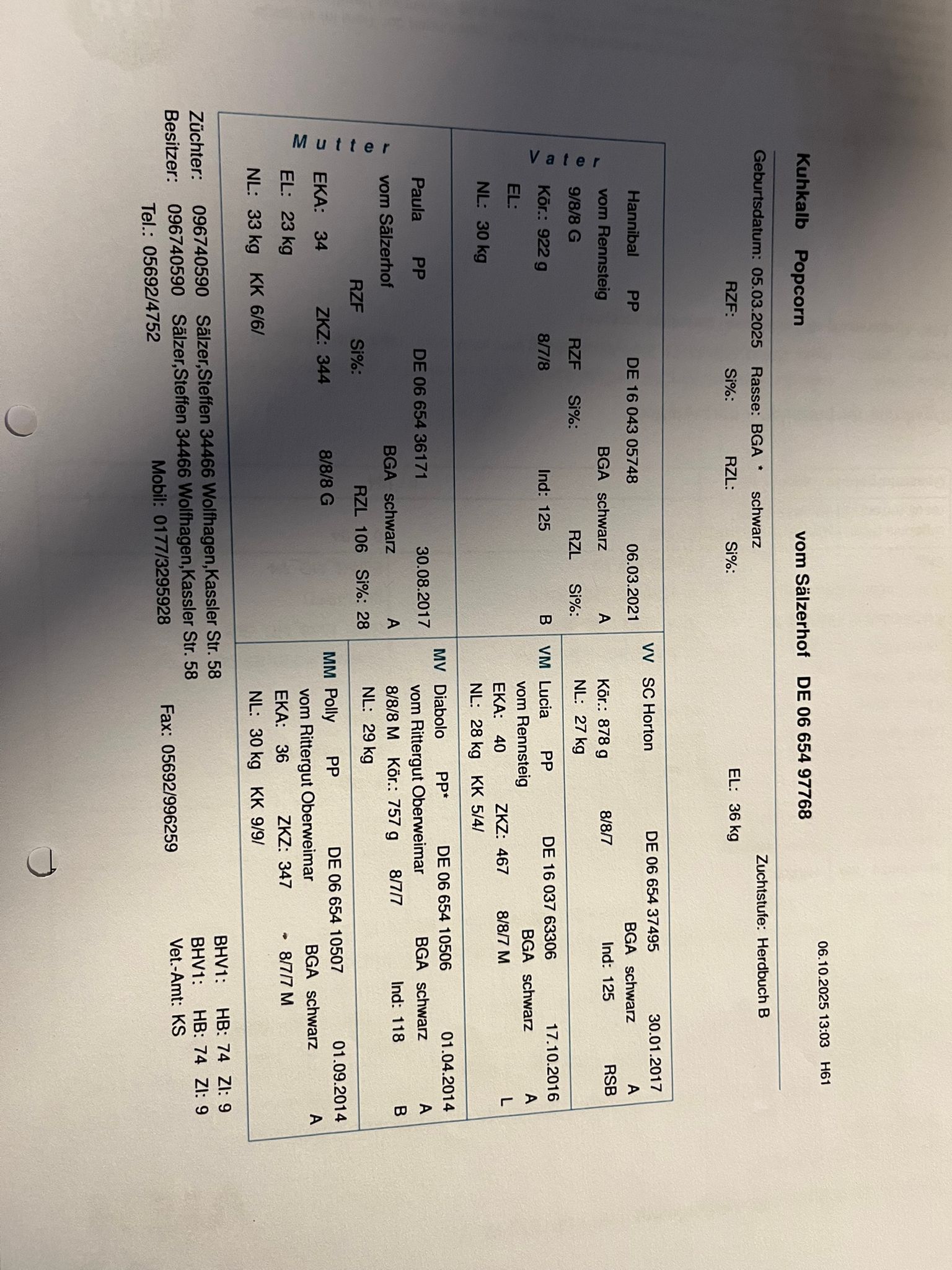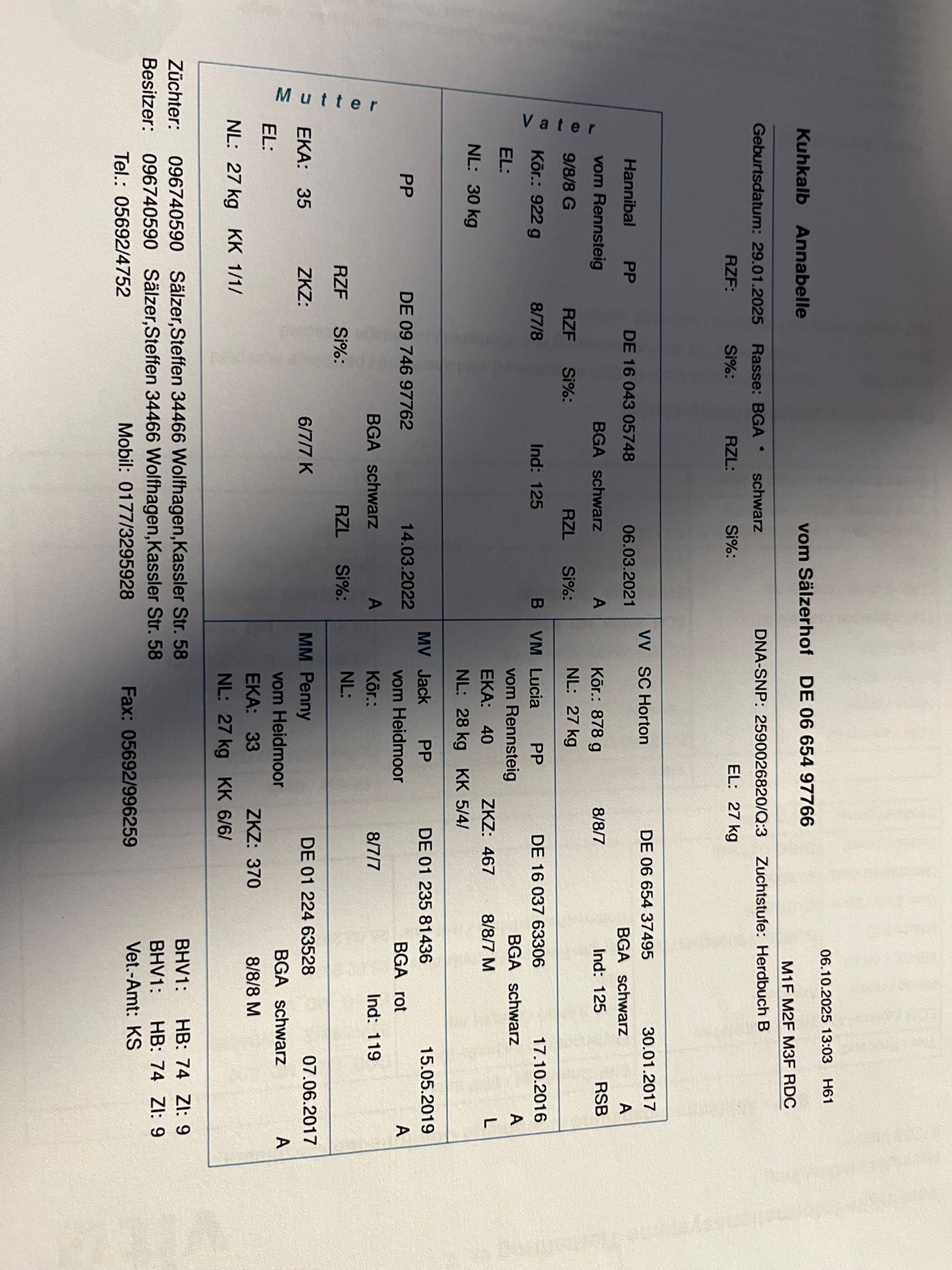 Ihr Vater ist unser Zuchtbulle Hannibal vom Rennsteig (9/8/8 G). Hannibal war bei der Galloway Open 2023 der Siegerbulle. Die Mutterlinie ist vollschottischer Abstammung, da der Vater von Lotti unser schottischer Zuchtbulle King war. King war 2022 der Bundessieger in Erfurt. Mutter von Lotti ist unsere schottische Zuchtkuh Lori (7/7/8 G).