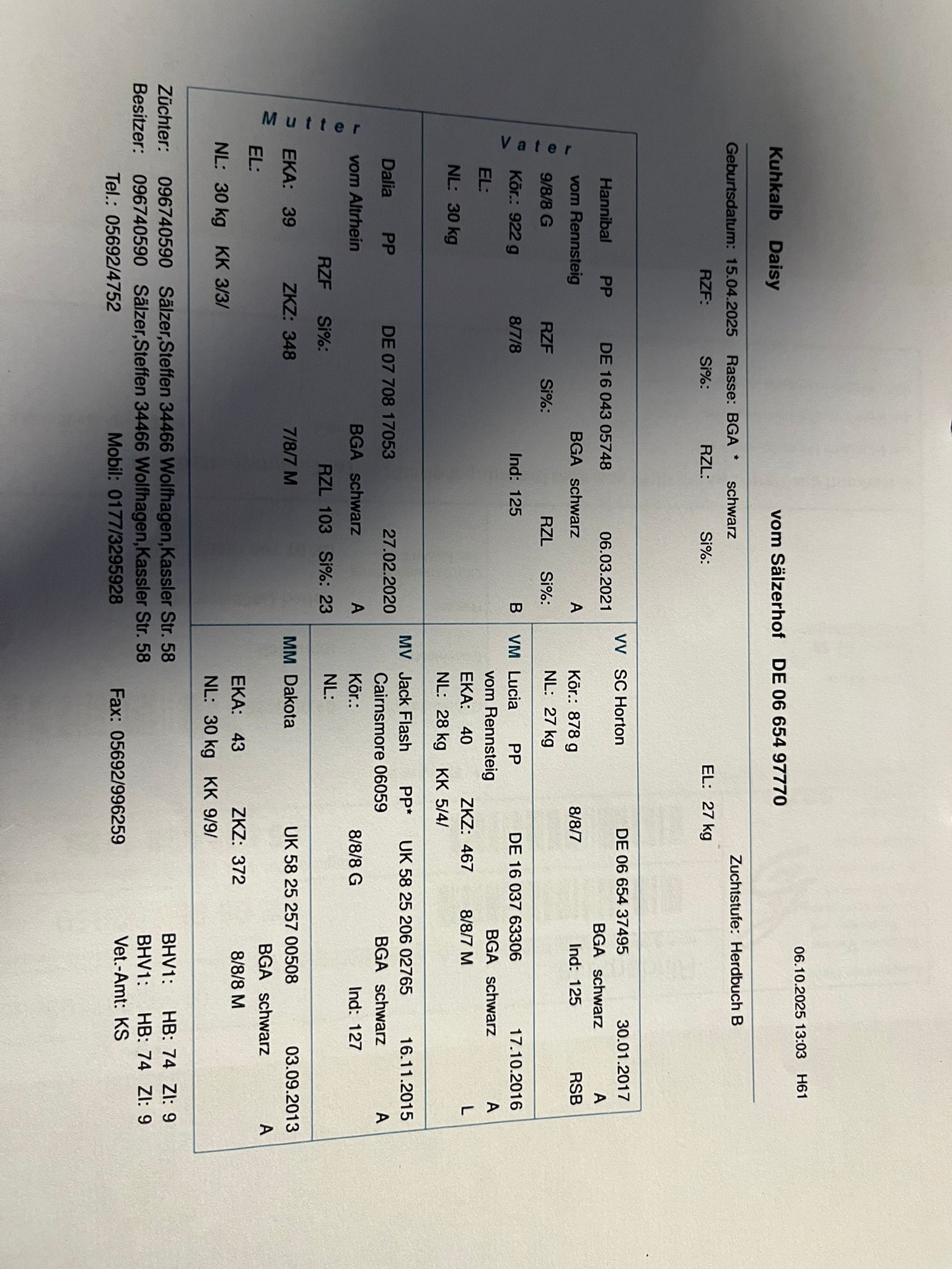 Ebenfalls wird aufgrund des starken Jahrgangs der Mädels unsere Färse Daisy zum Verkauf angeboten. Daisy wurde im April 2025 geboren und ist die Tochter unserer Zuchtkuh Dalia vom Altrhein (7/7/7 M) und Vater ist wie bei dem kompletten Jahrgang unser Zuchtbulle Hannibal (9/8/8 G). Daisy entstammt somit einer komplett zugekauften Linie. Sie ist eine eher zurückhaltende, aber ruhige Färse.