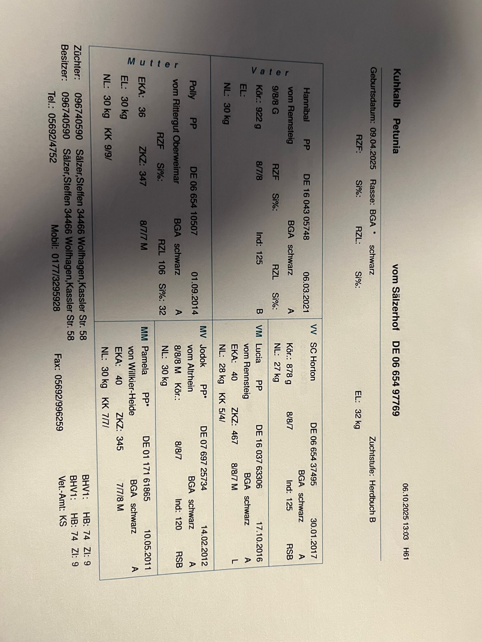 Auch unsere Färse Petunia bieten wir zum Verkauf an. Petunia wurde im April 2025 als letztes Kalb unserer ehemaligen Zuchtkuh Polly (8/7/7 M) geboren, welche auch die Mutter unserer Zuchtkuh Paula ist. Vater ist ebenfalls unser Zuchtbulle Hannibal (9/8/8 G). Petunia ist halfterführig und hat ein ruhiges Wesen.