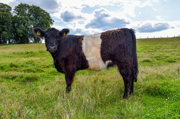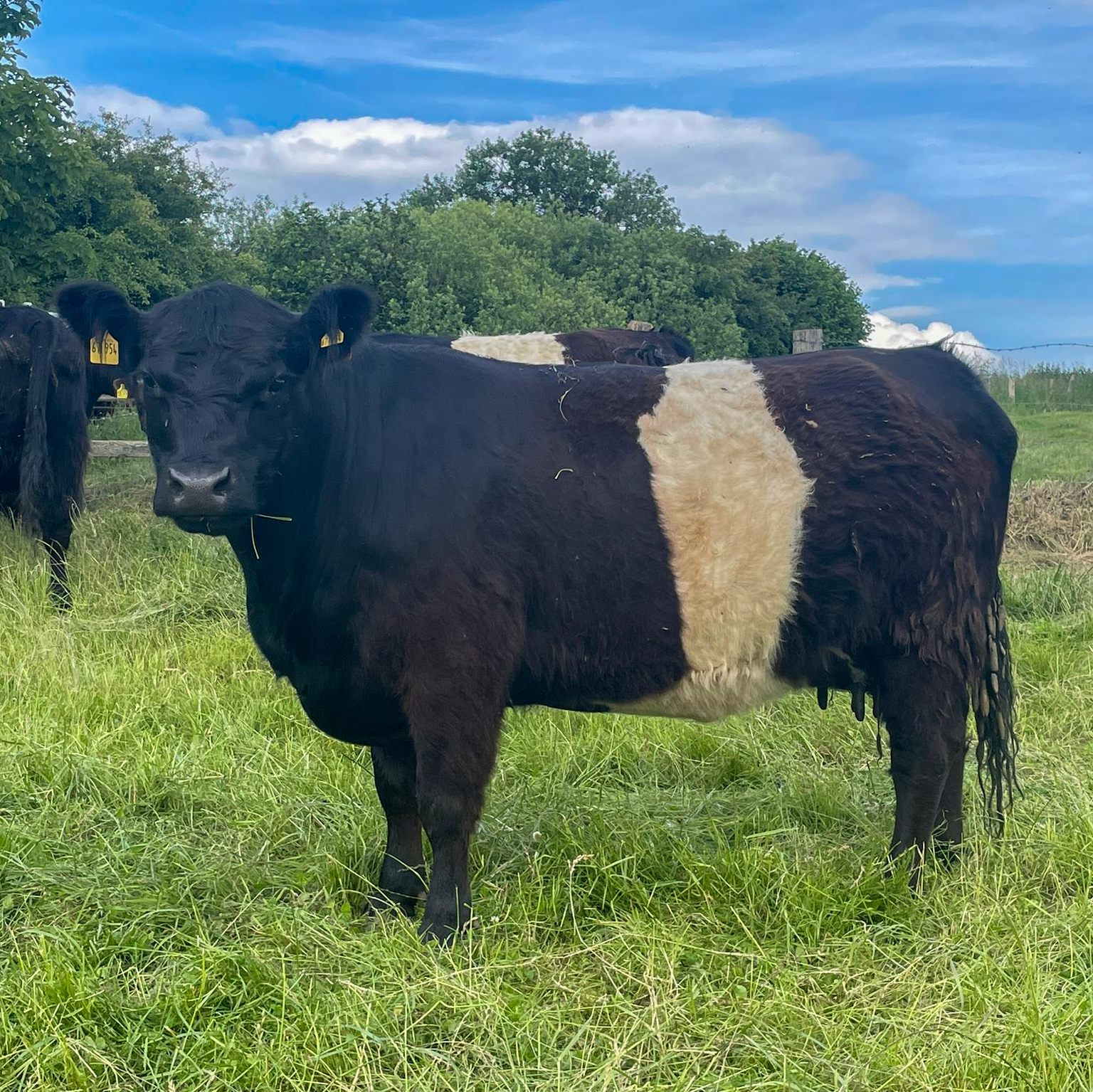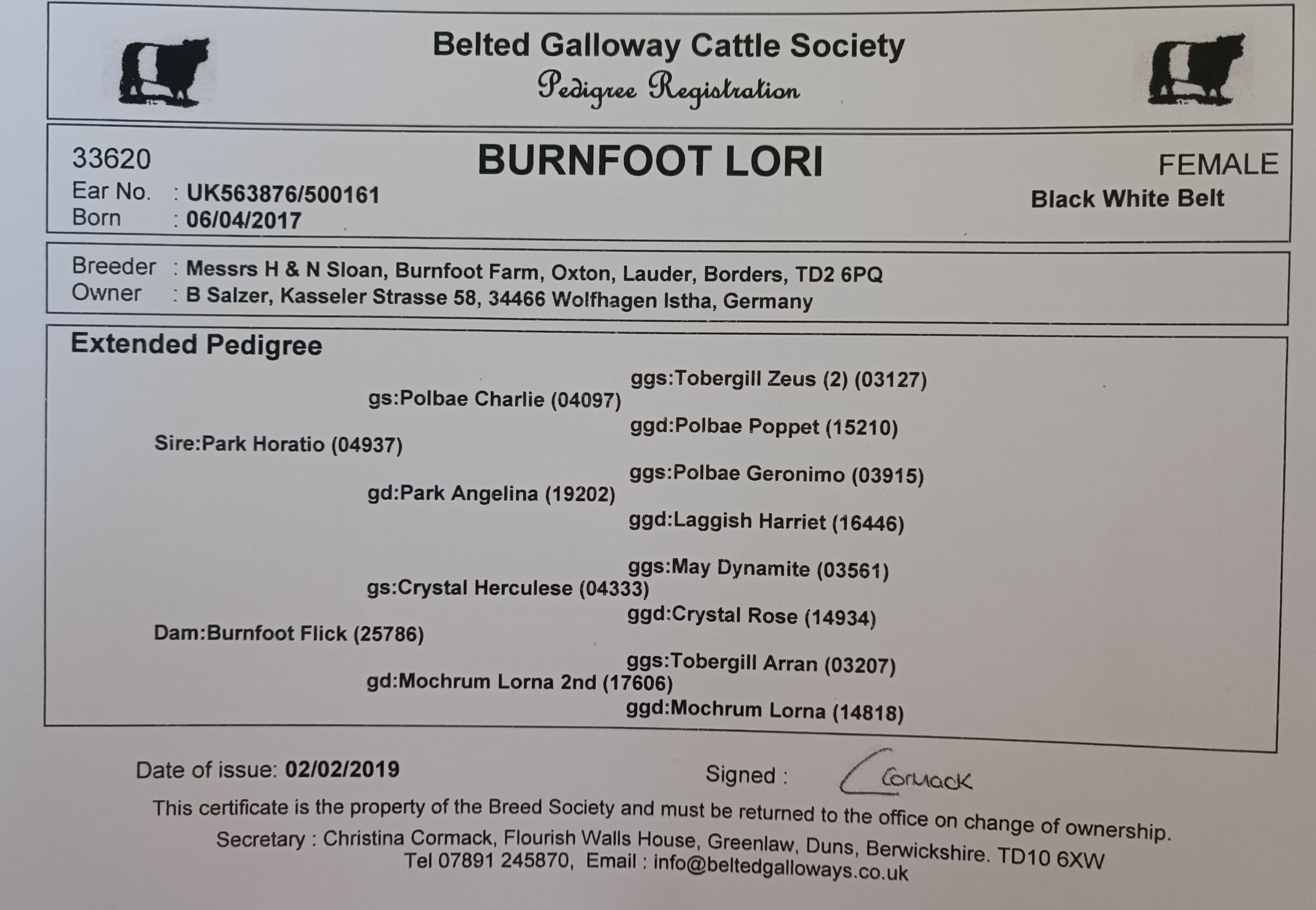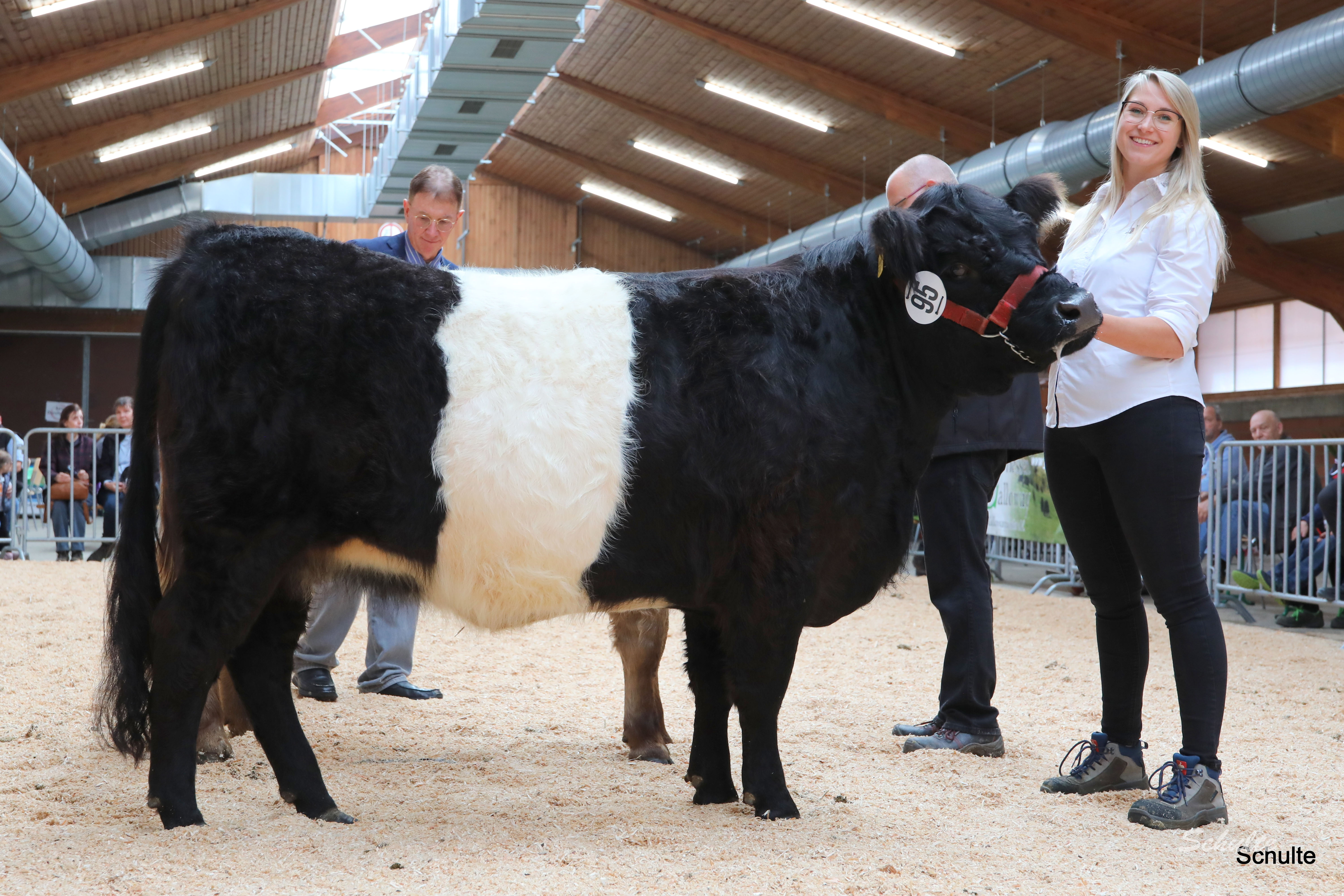 Sie ist eine aufgeweckte und halfterführige Kuh. Bei den Galloway Open 2023 in Alsfeld haben wir sie noch als Färse vorgestellt, wo sie den Reservesieg der Beltie- Färsen errungen hat.