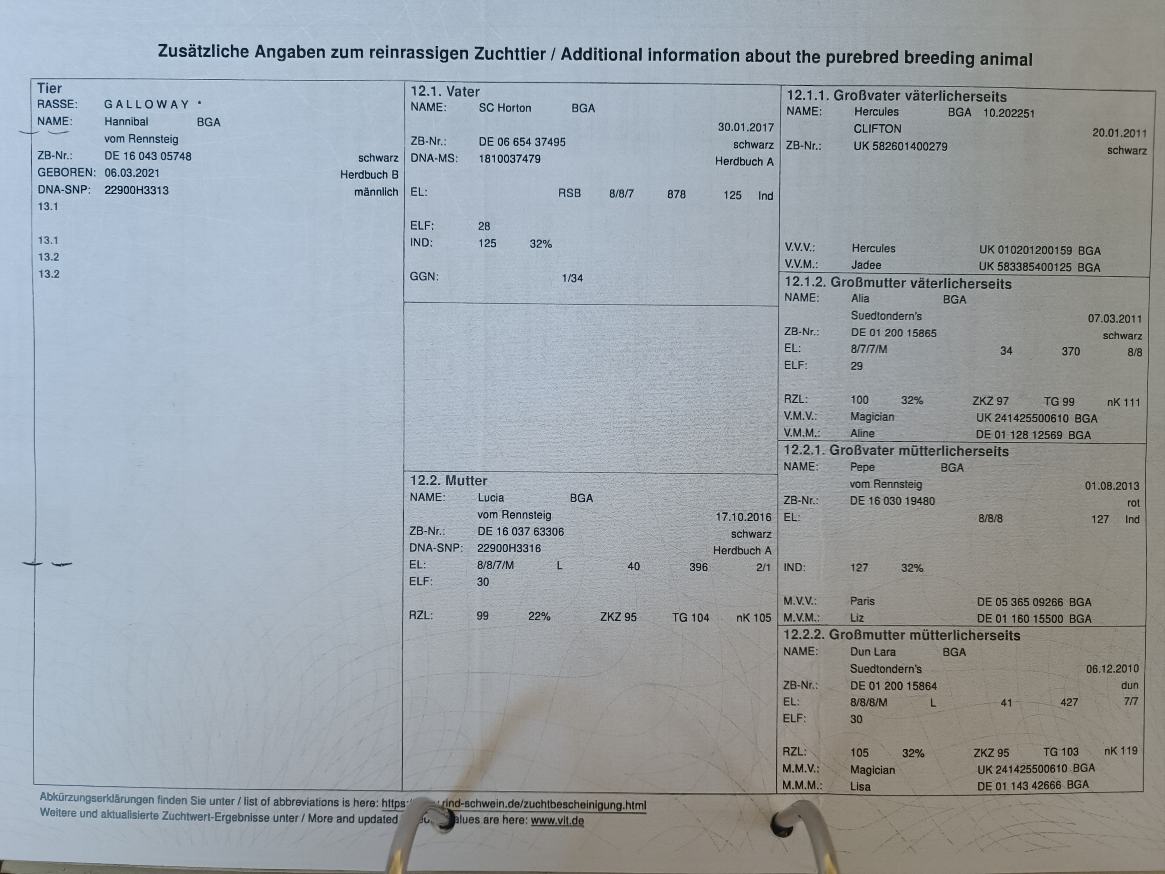 Hannibal wurde im März 2021 geboren und ist bei der Galloway Open 2023 in Alsfeld als Sieger der Belted Galloway Bullen gekürt worden. Er tragt daher den Titel Mr. Beltie 2023.